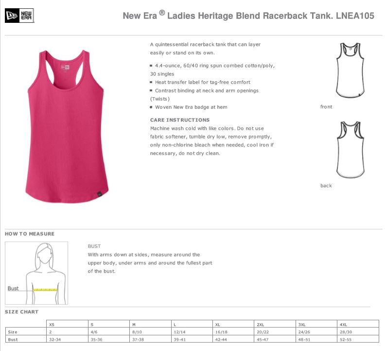 Ladies New Era Heritage Racer Back Tank. Light-weight 60/40 ring spun combed cotton/poly blend. Available in Grey and Black, sizes Ladies Sizes XS-4XL.